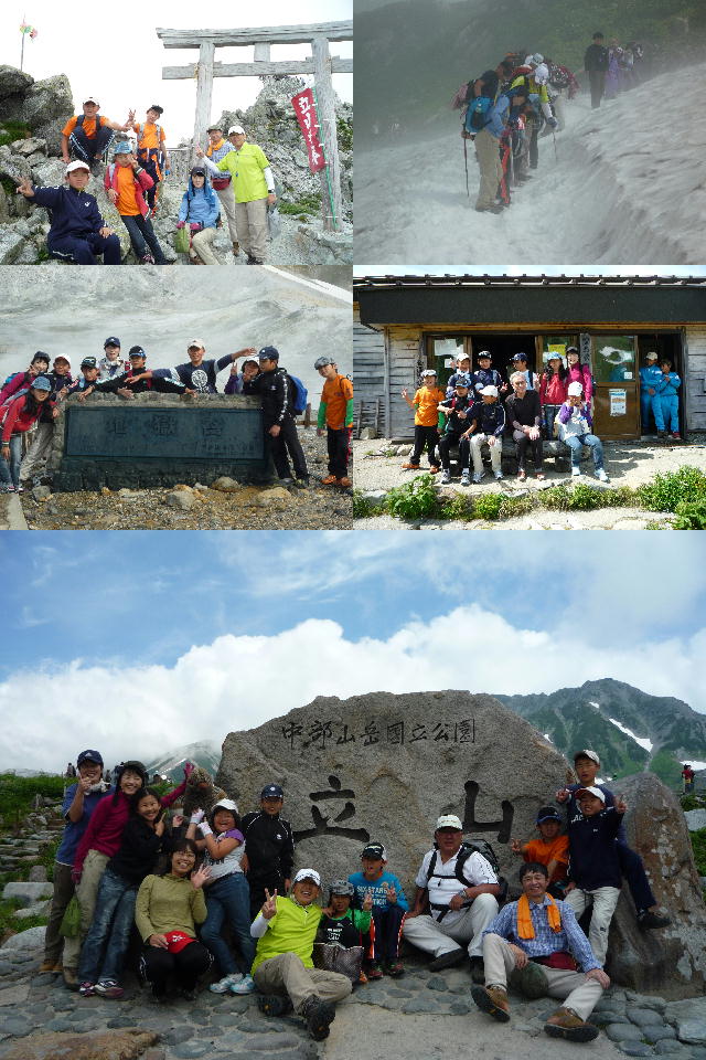 1日目:子供たち4名と指導員3名が登頂、雪渓下りは滑りまくり、 2日目:雷鳥沢診療所にて森外科医(森元総理の実弟)と合流 |